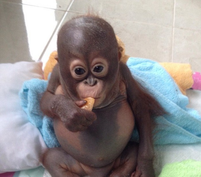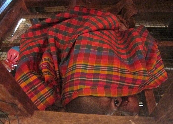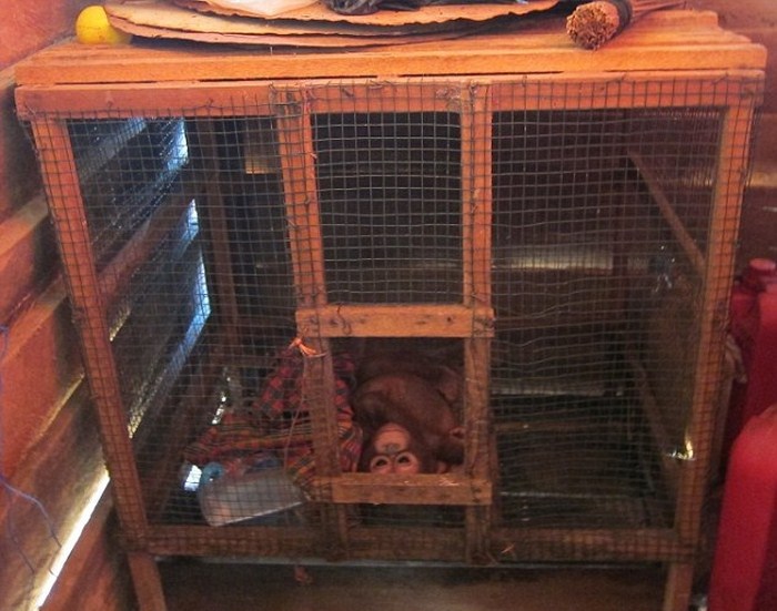 Casi inmediatamente después de su nacimiento, el bebé orangután fue metido en una jaula para pollos, donde pasó sus primeros 10 meses de su vida. Para protegerse, solo tenía una manta delgada.